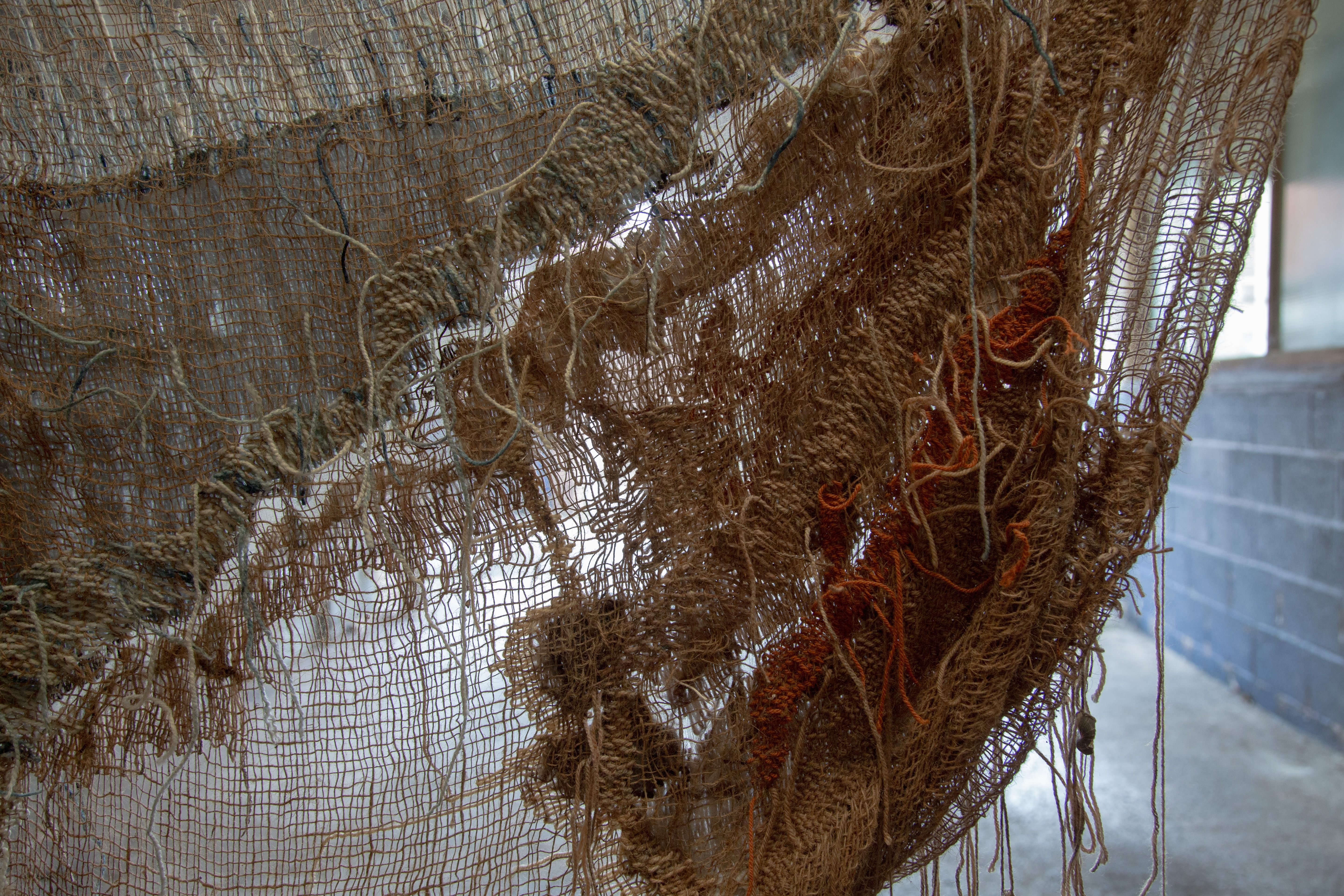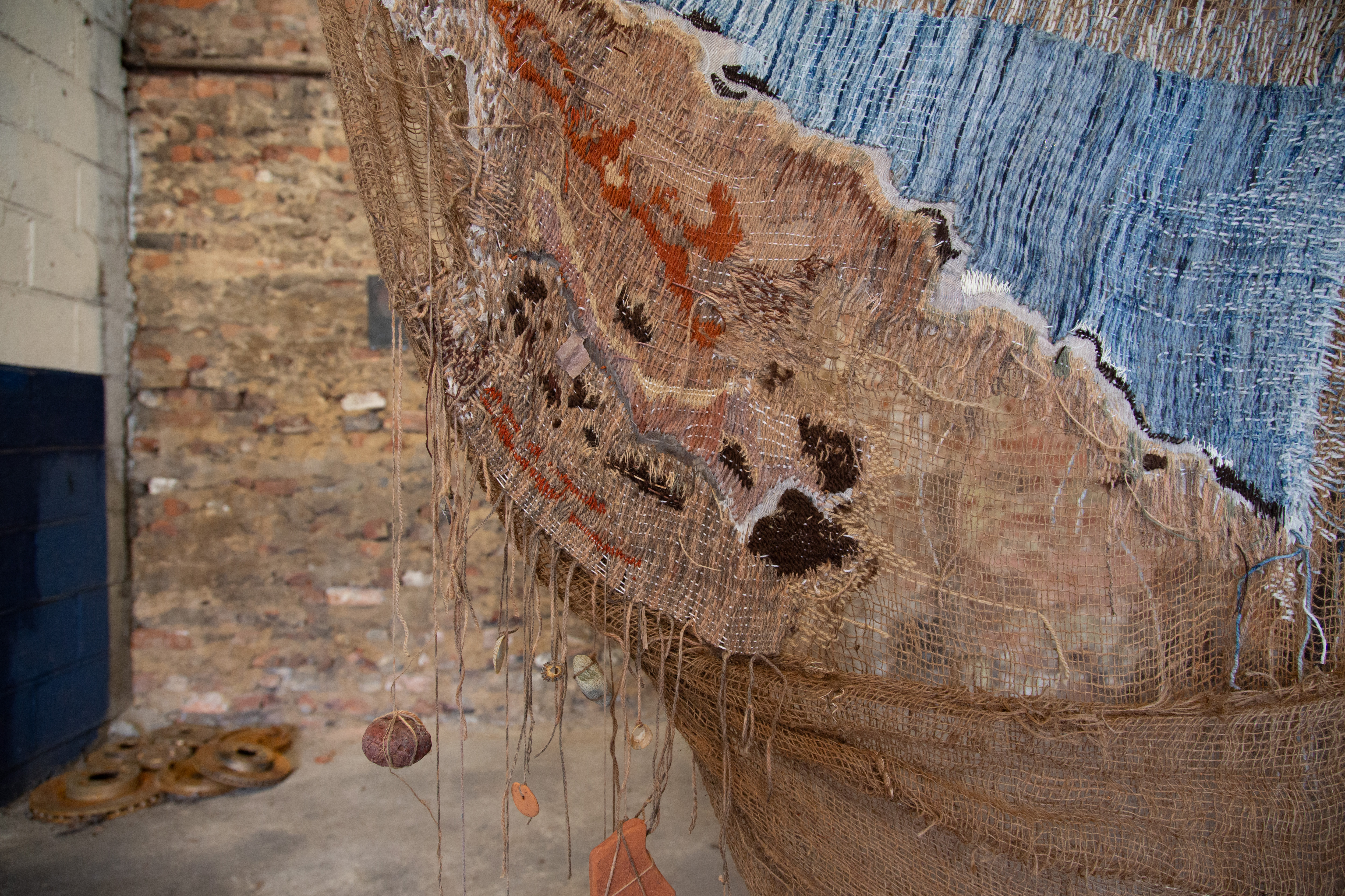 Wool, silk thread, hemp, hessian scrim, muslin, stones, shells, terracotta, found car cog, spirulina, iron oxide, peat, leaf stems.