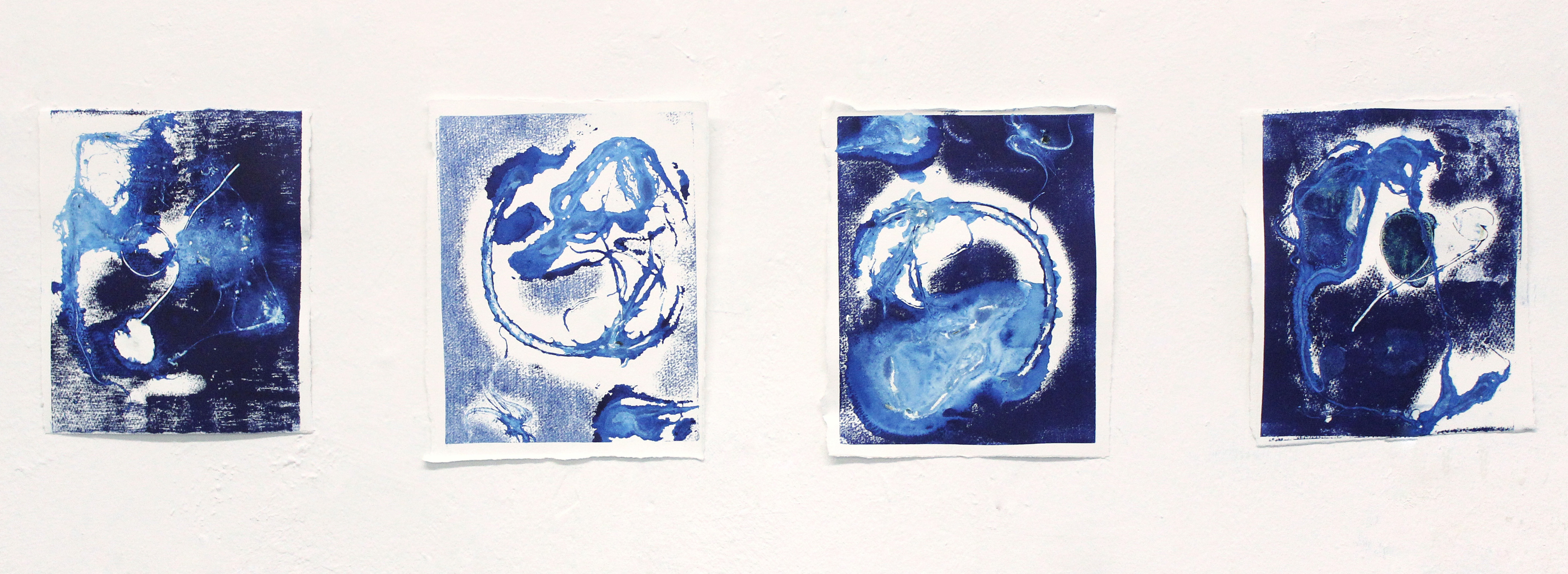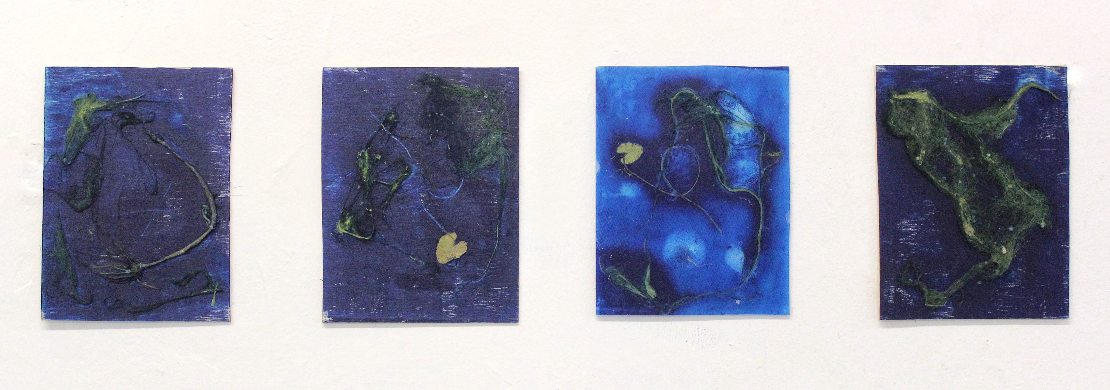 Algae and salmon roe negative relief prints, ink on wood and pyrex.