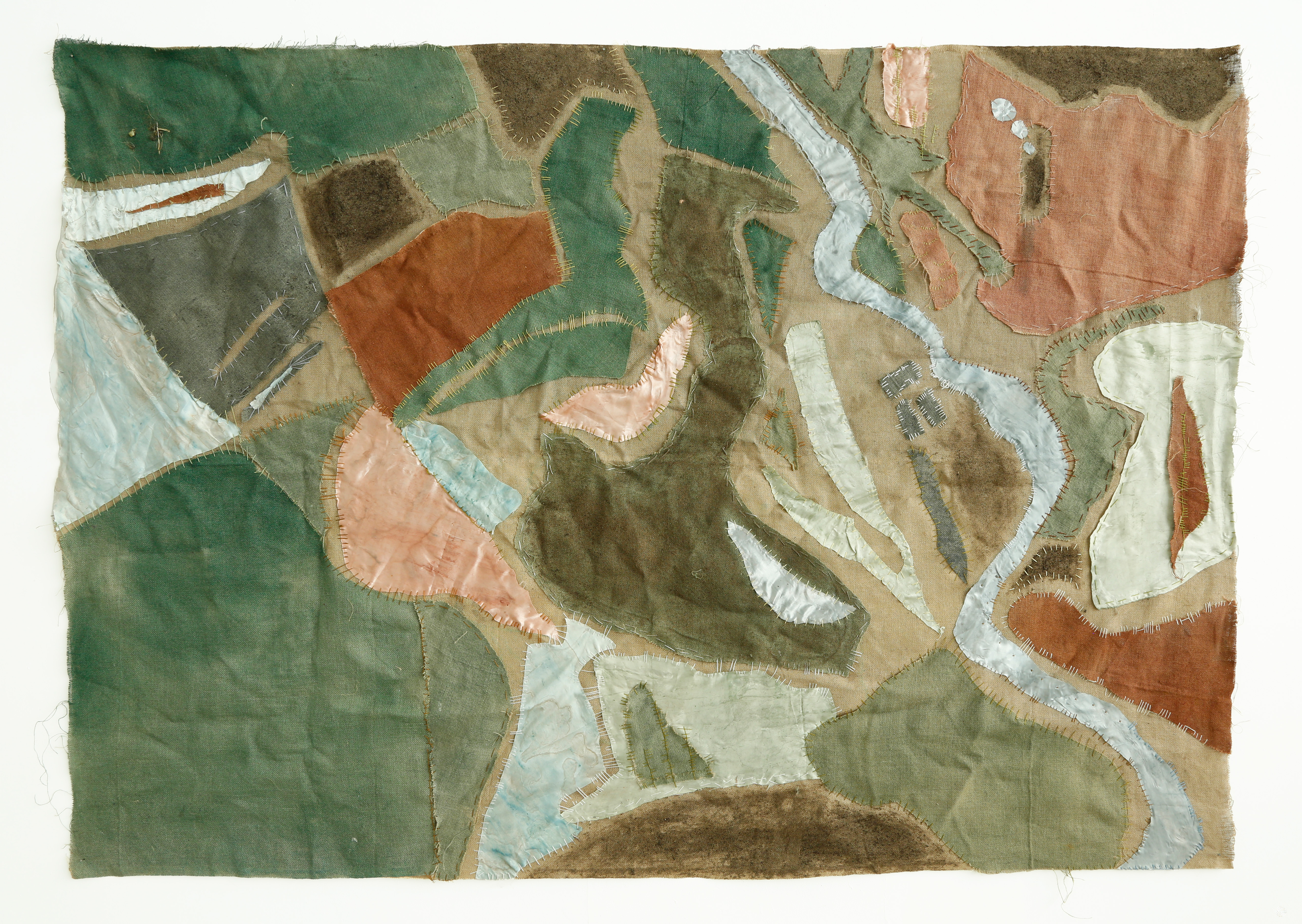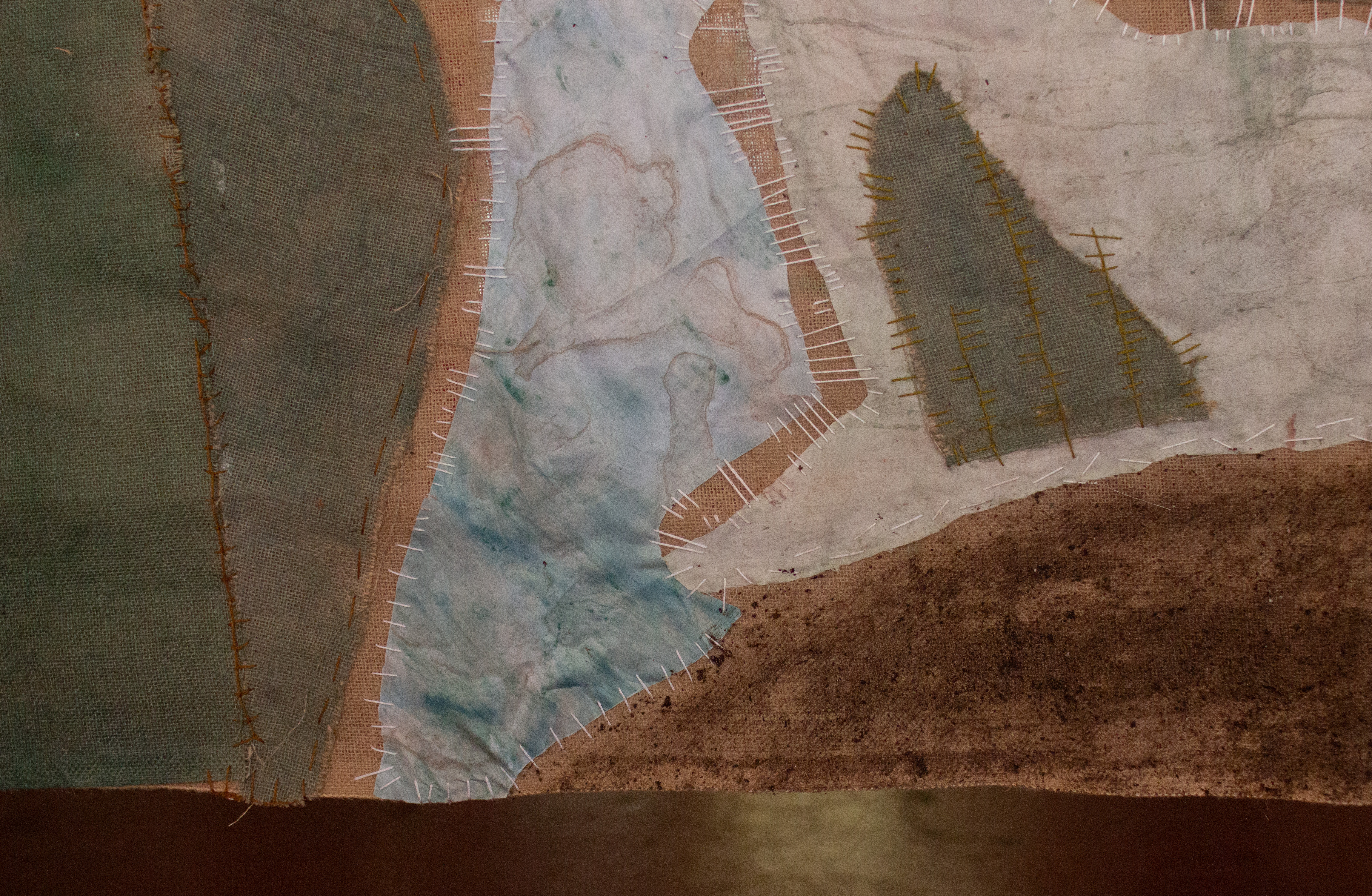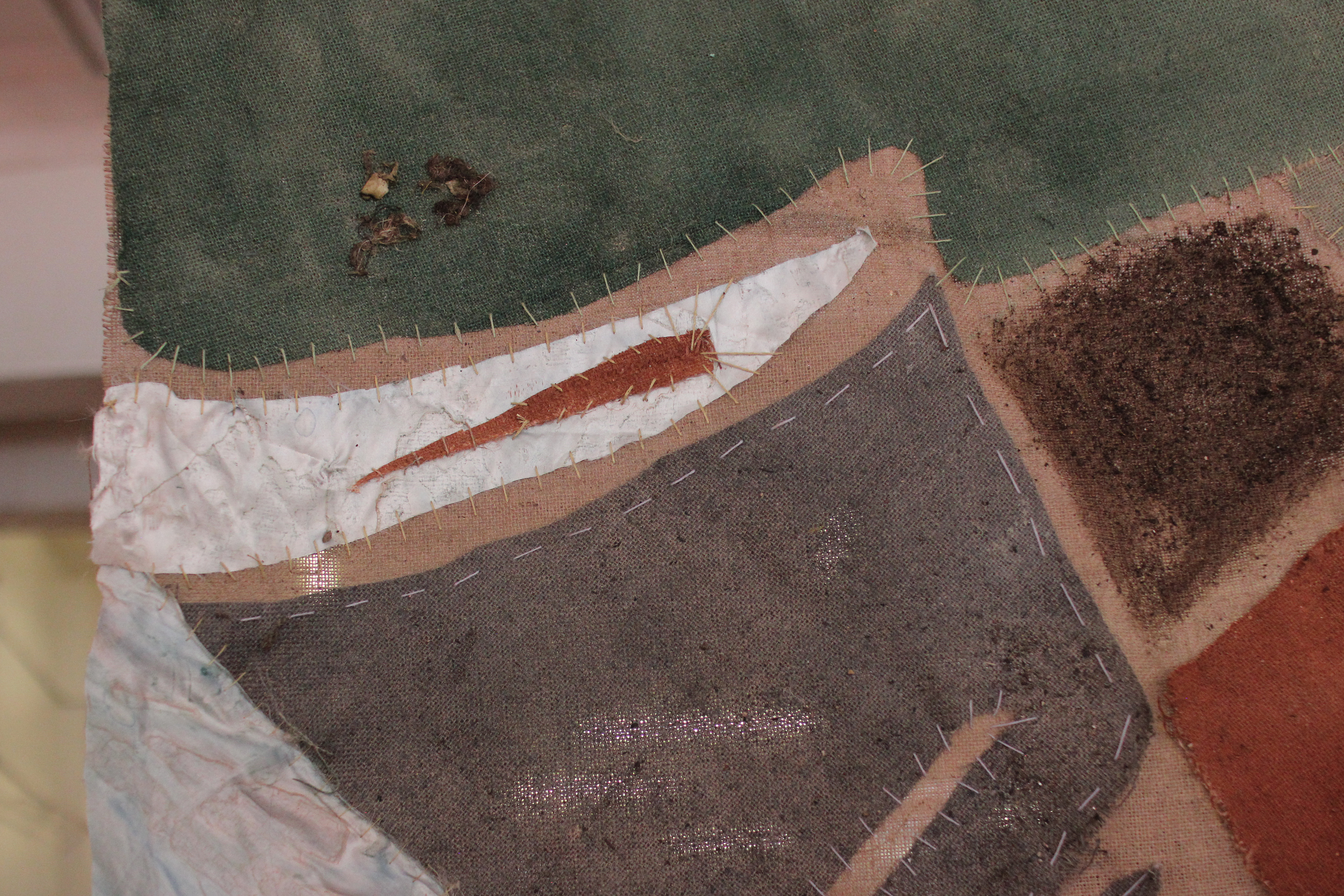 Hessian, satin, river silt, soil, spirulina, iron oxide, peat, silk thread, heather, horseshoe, salmon nursery stones.