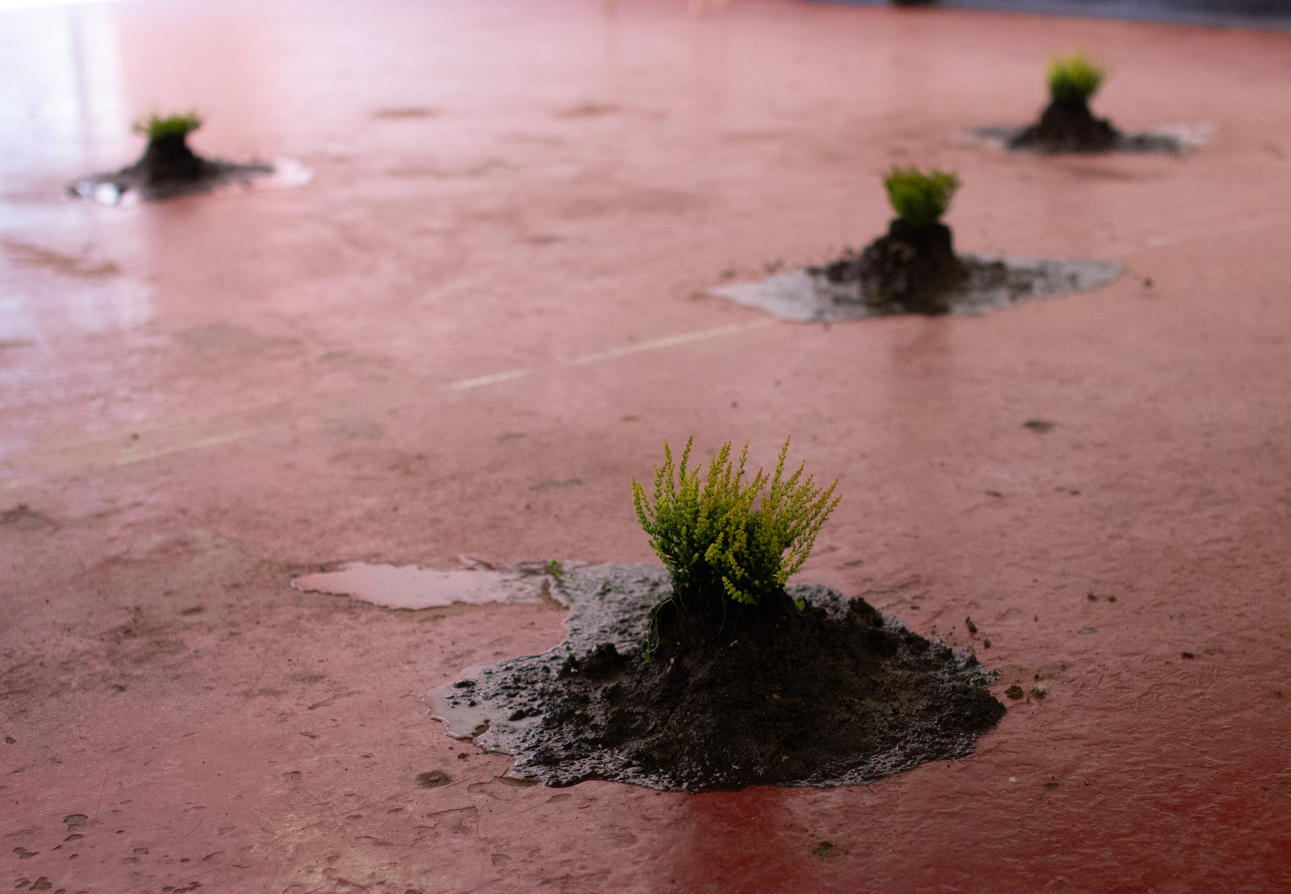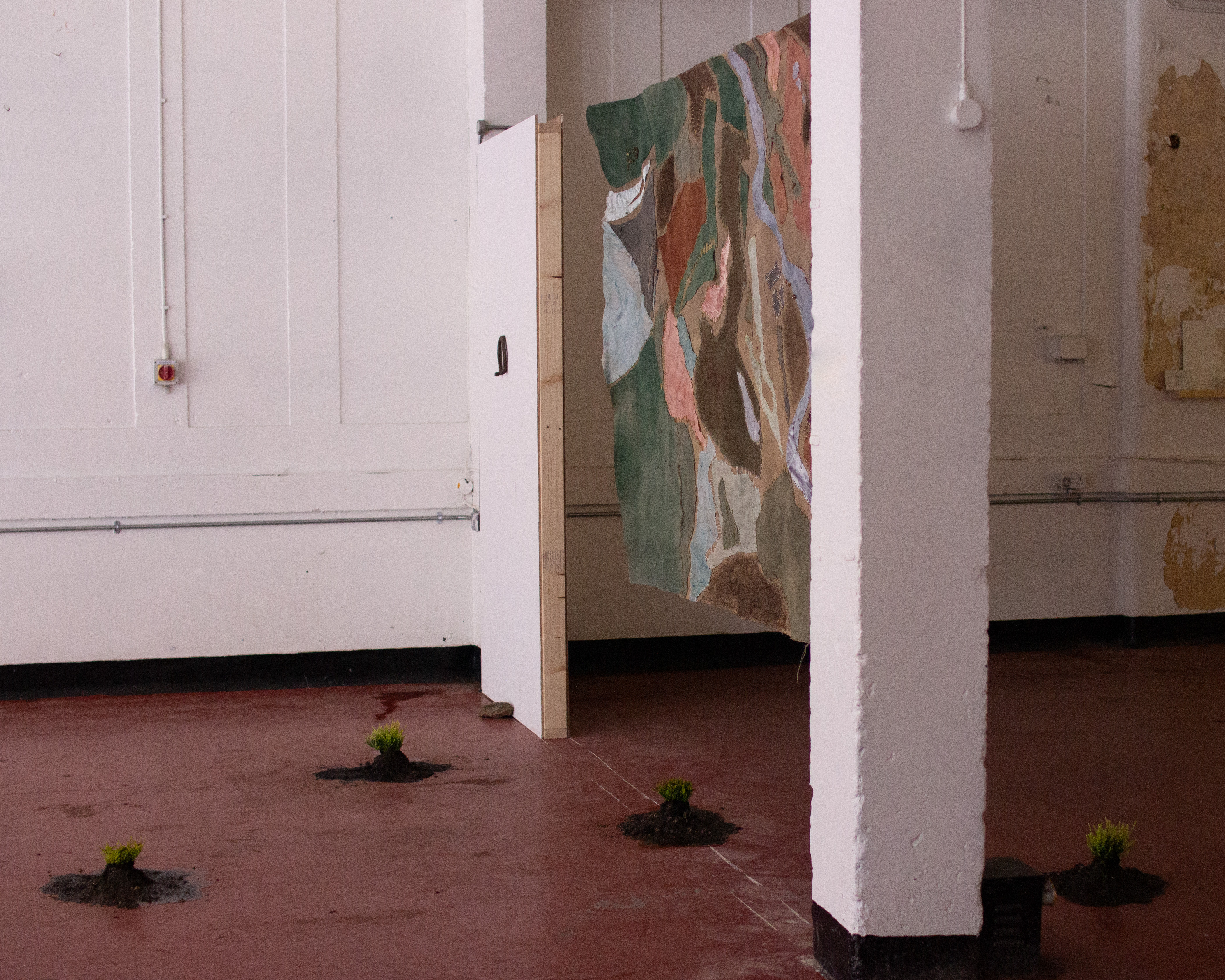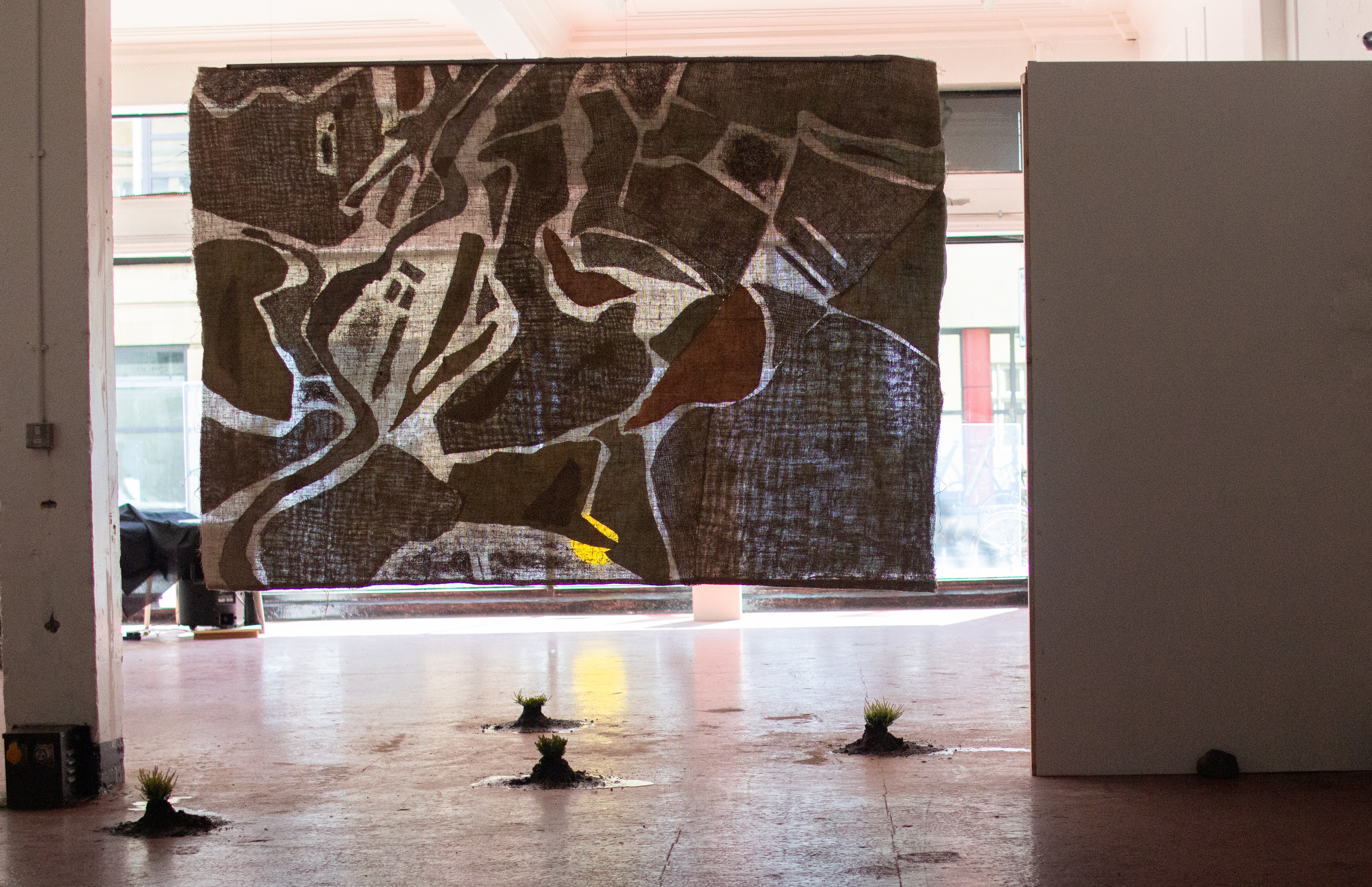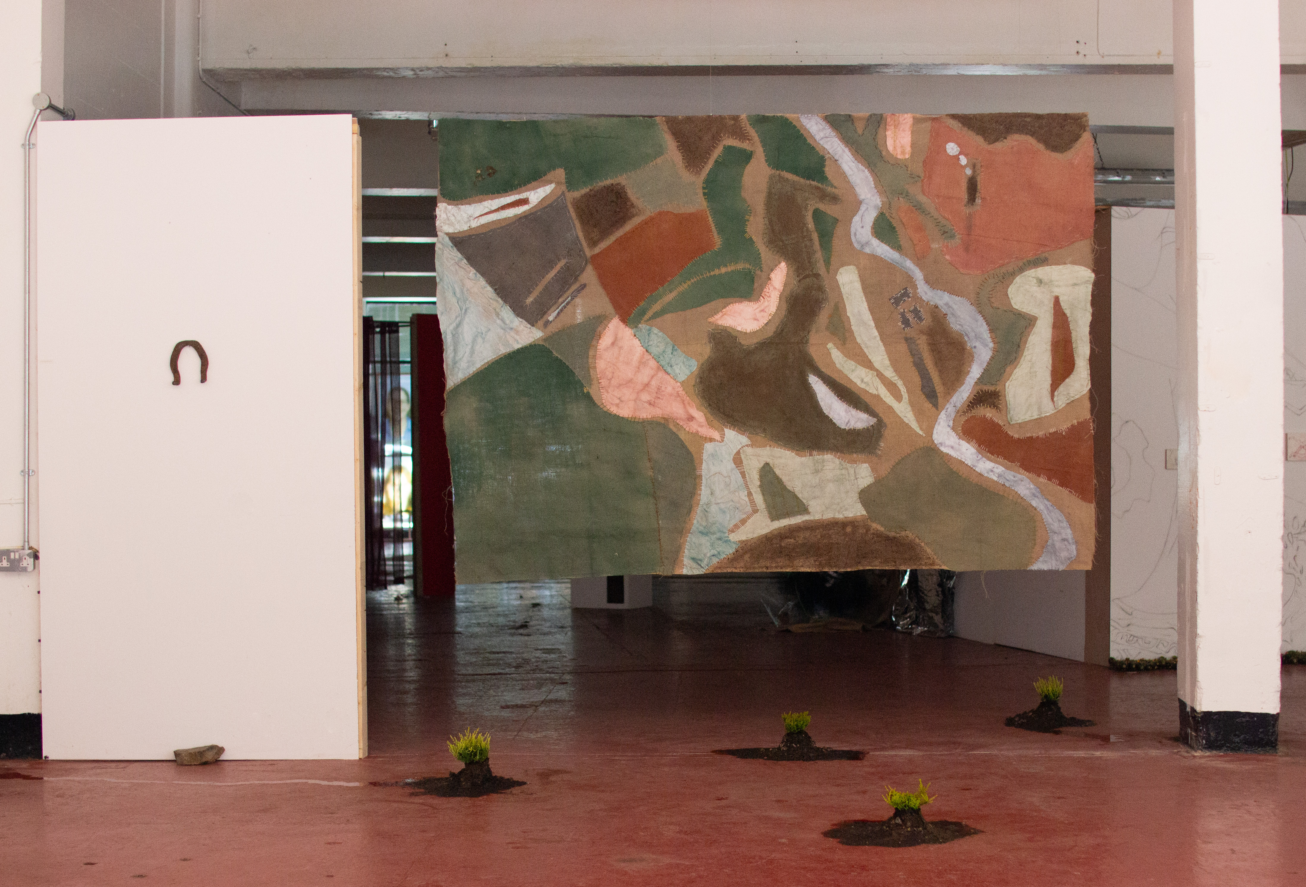 Hessian, satin, river silt, soil, spirulina, iron oxide, peat, silk thread, heather, horseshoe, salmon nursery stones.