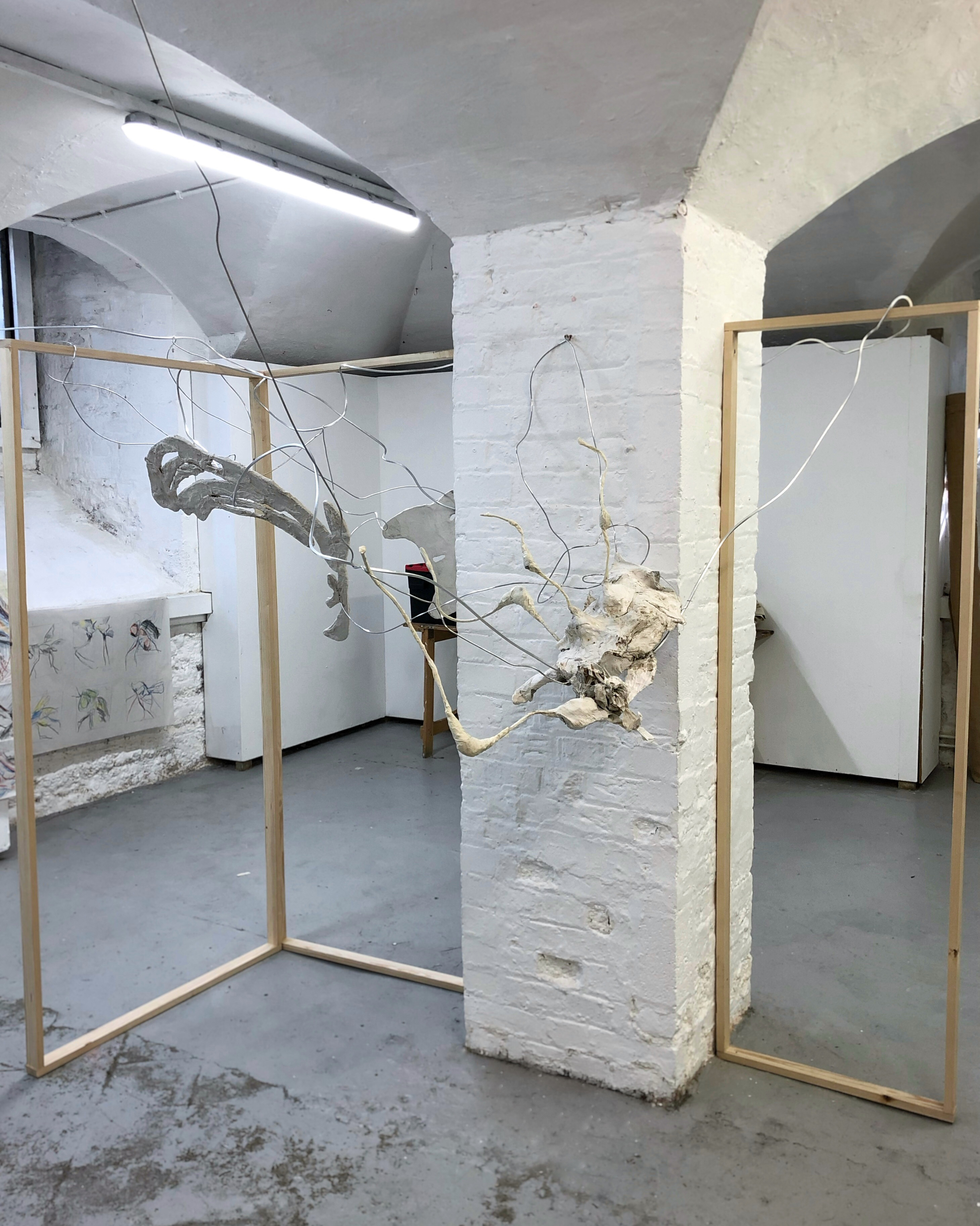 Mesh, wire, paper, laser cut drawings in wood, plaster, mod rock.