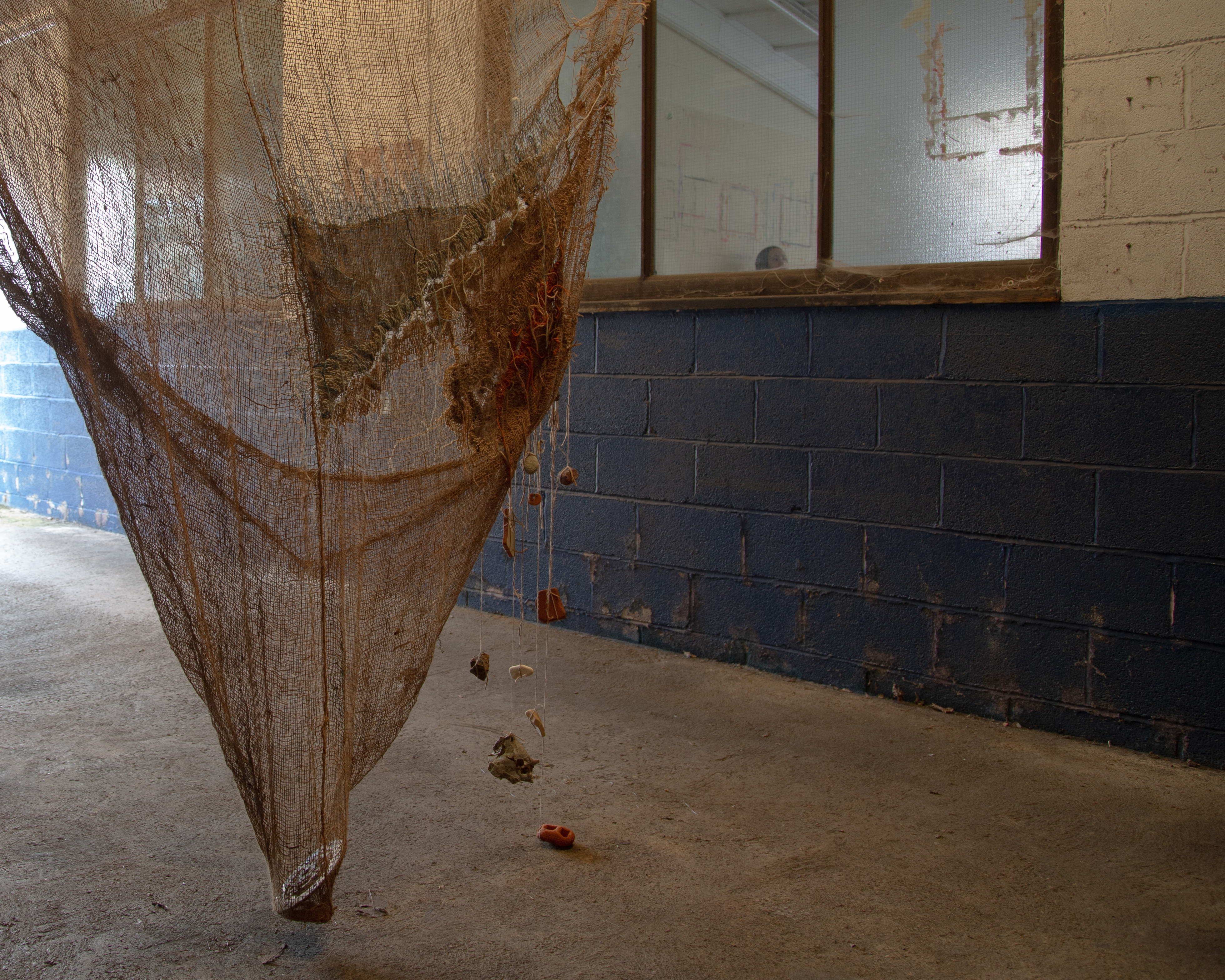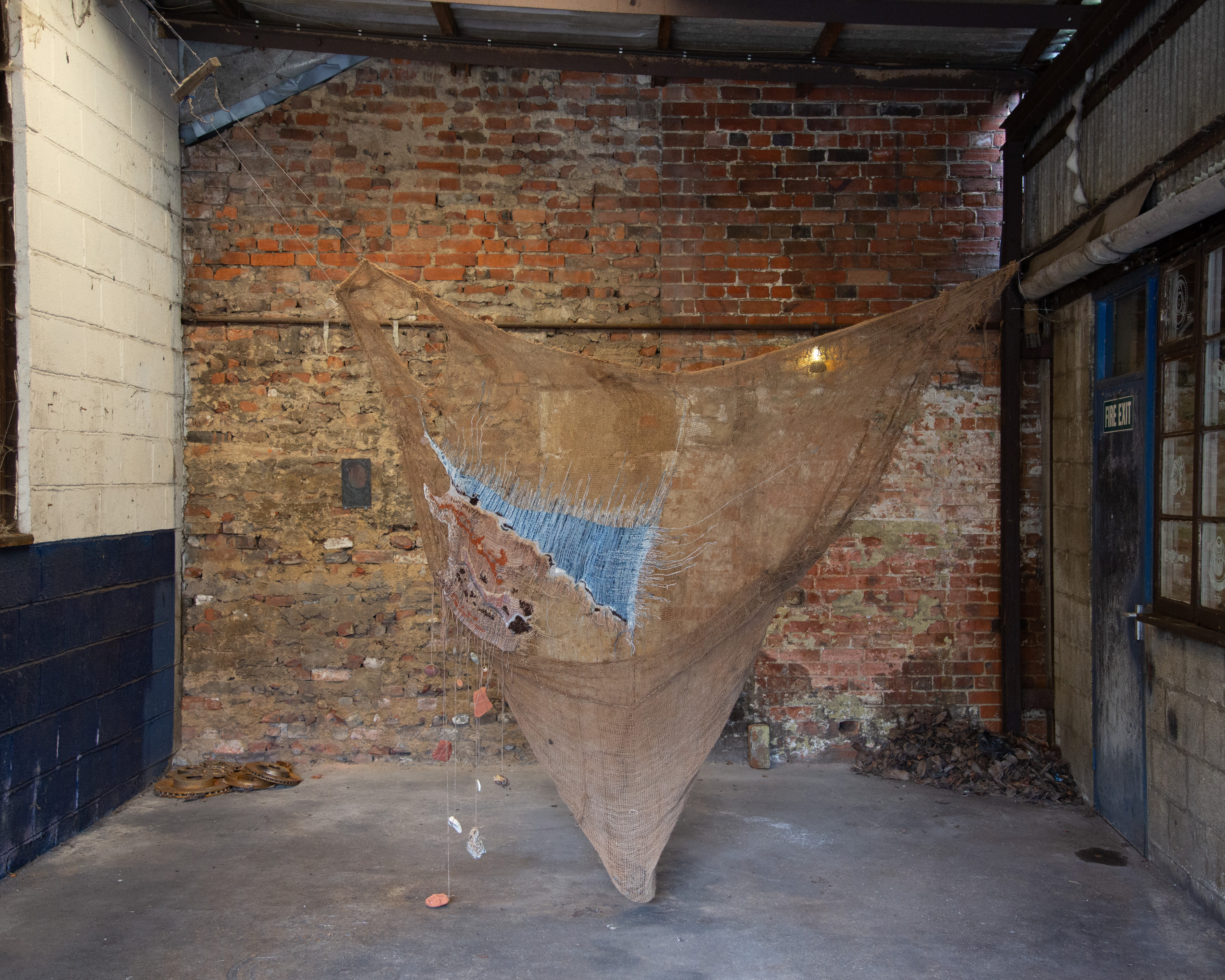 Wool, silk thread, hemp, hessian scrim, muslin, stones, shells, terracotta, found car cog, spirulina, iron oxide, peat, leaf stems.