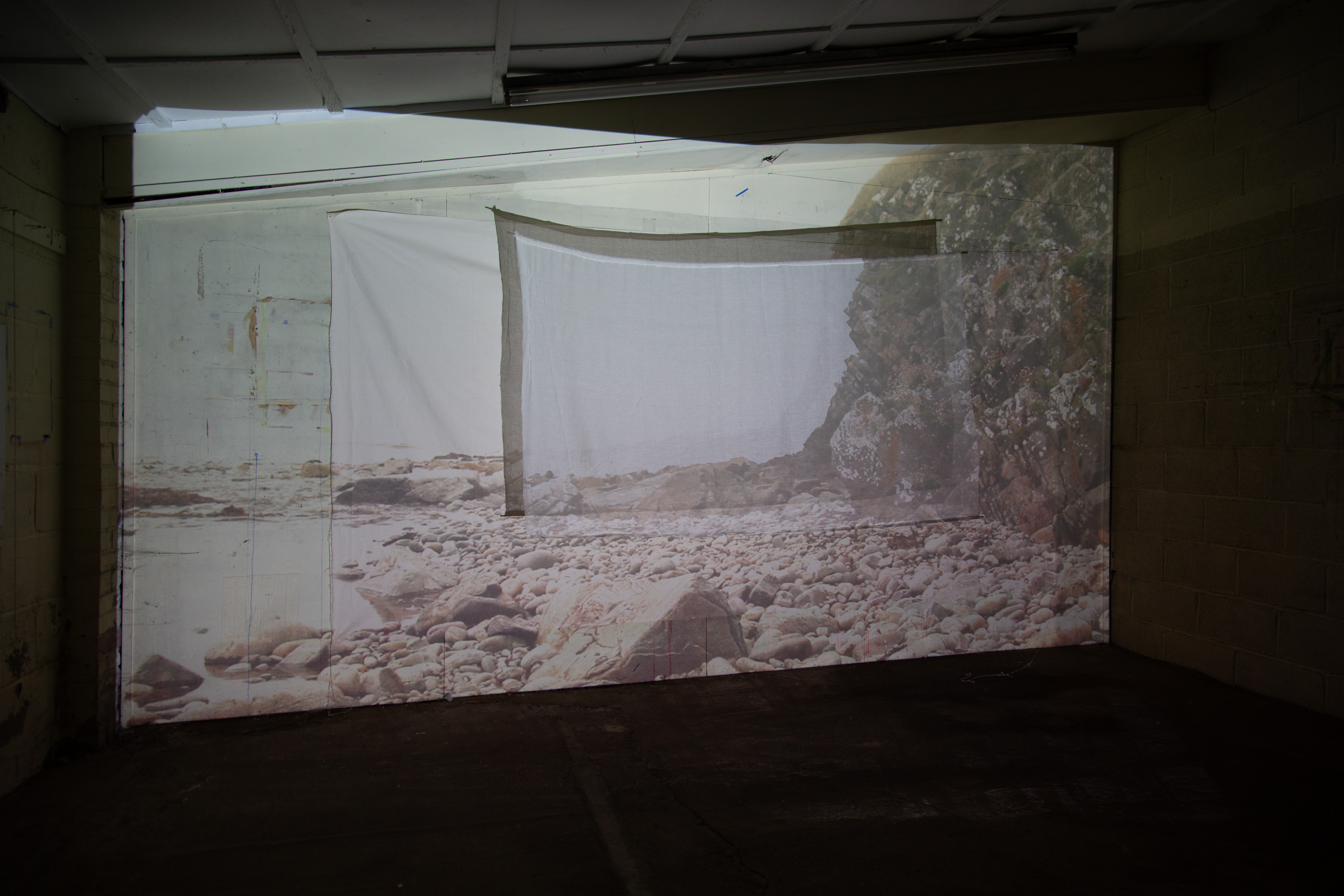 Installation view from 'Edgelands', 2026, duo show on muslin and canvas.